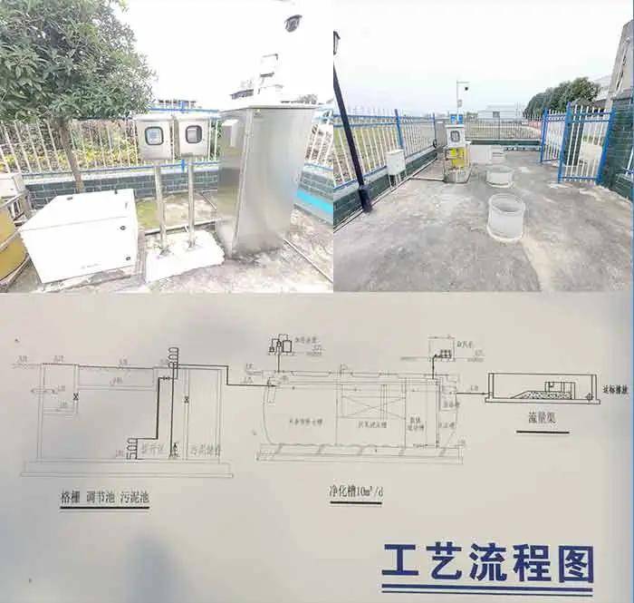 (黄土镇盐井村9组(左)、 塔水镇赤林村污水处理站2组(右)千村净化池场景之一,及污水净化工艺流程)